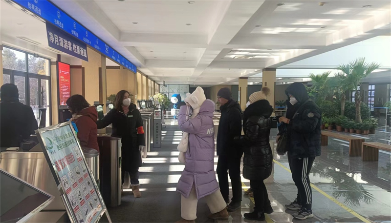 春节期间,由于游客数量激增,所有工作人员都超负荷劳动,领导亲自带队,在寒冷的室外指挥游客有序排队购票入园,室内工作人员也放弃岗位间歇的短暂休息时间,全力以赴投入到工作中,协助游客线上购票、耐心解释游客的问询、验证、检票。同时稽查队员和巡护人员也坚守在一线岗位,在景区内指挥入园车辆,为游客的安全出行保驾护航。党员们纷纷表示,看到游客们开心的笑容,我们再苦再累都值得。