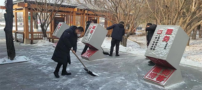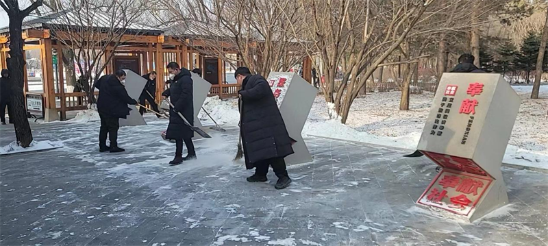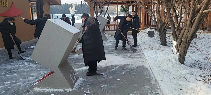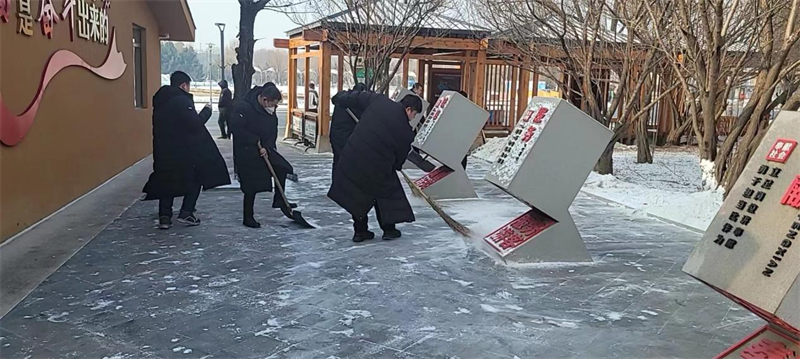 在支部书记的带领下,大家拿着铁锹、扫帚,对路面进行清扫,弯腰俯身的身影在景区内形成一片风景,虽然天气很冷,但大家热情似火,干劲十足,以劳动为荣,乐在其中,按照各自的分工,团结合作,对观光车售票处及乘车站周边、进行了彻底清理。