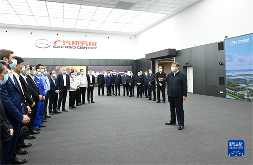 习近平随后来到广汽埃安新能源汽车股份有限公司考察。他走进企业展厅、总装车间、电池生产车间等,了解企业突破关键核心技术和推动制造业高端化、智能化、绿色化等进展情况。在广汽研究院,习近平仔细察看智能网联实验室、模型设计实验室等,并同科技人员、企业家、职工、外资企业代表等交流。习近平指出,中国改革开放政策将长久不变,永远不会自己关上开放的大门。一切愿意与我们合作共赢的国家,我们都愿意与他们相向而行,推动世界经济共同繁荣发展。习近平强调,中国是个大国,要重视实体经济,走自力更生之路。关键核心技术要立足自主研发,也欢迎国际合作。要加强教育和人才培养,夯实科技自立自强根基。