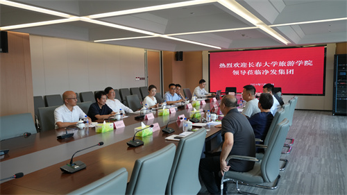 杜峥平董事长首先对刘耀辉校长一行的到访表示热烈欢迎,并详细介绍了公司的发展历程、核心业务,尤其在文旅产业方面的发展优势及未来规划。杜峥平表示,文旅产业是BEATS365官网主导产业,更是特色优势所在,愿意与旅游学院在专业人才培育、实习实践、产教融合等方面开展全方位、多层次的合作,共同为区域文旅产业及经济发展作出更大贡献。期间,双方共同观看了净月区及BEATS365官网文旅产业宣传片,听取了影视文创孵化园及国际影都产业服务链等情况介绍。