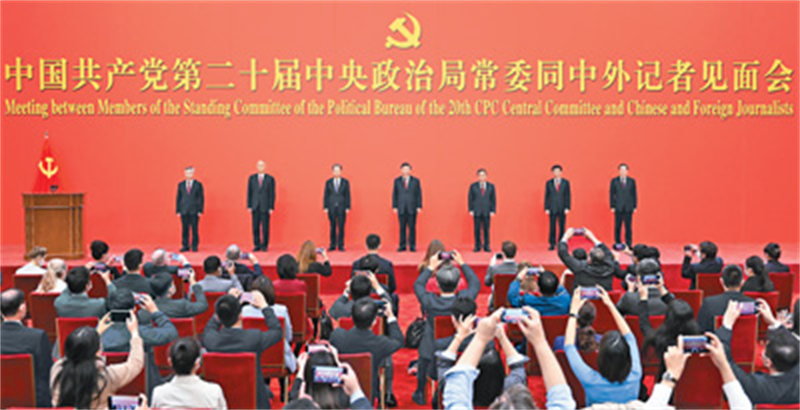 10月23日,刚刚在中国共产党第二十届中央委员会第一次全体会议上当选的中共中央总书记习近平和中共中央政治局常委李强、赵乐际、王沪宁、蔡奇、丁薛祥、李希在北京人民大会堂同采访中共二十大的中外记者亲切见面。新华社记者 申 宏摄